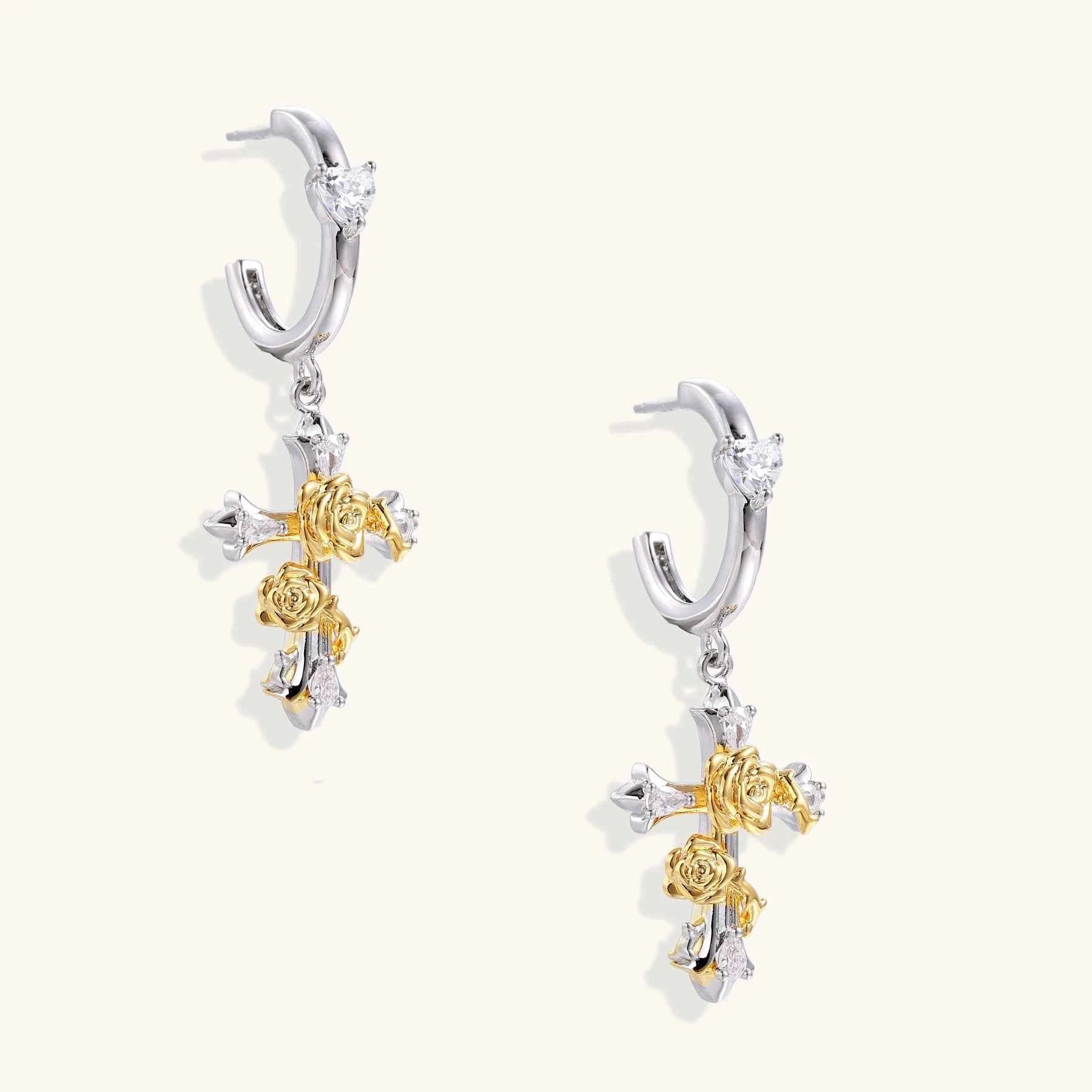 Ornate cross-shaped dangle earrings with gold roses and sparkling zirconia stars on silver-toned base with hoop closures.