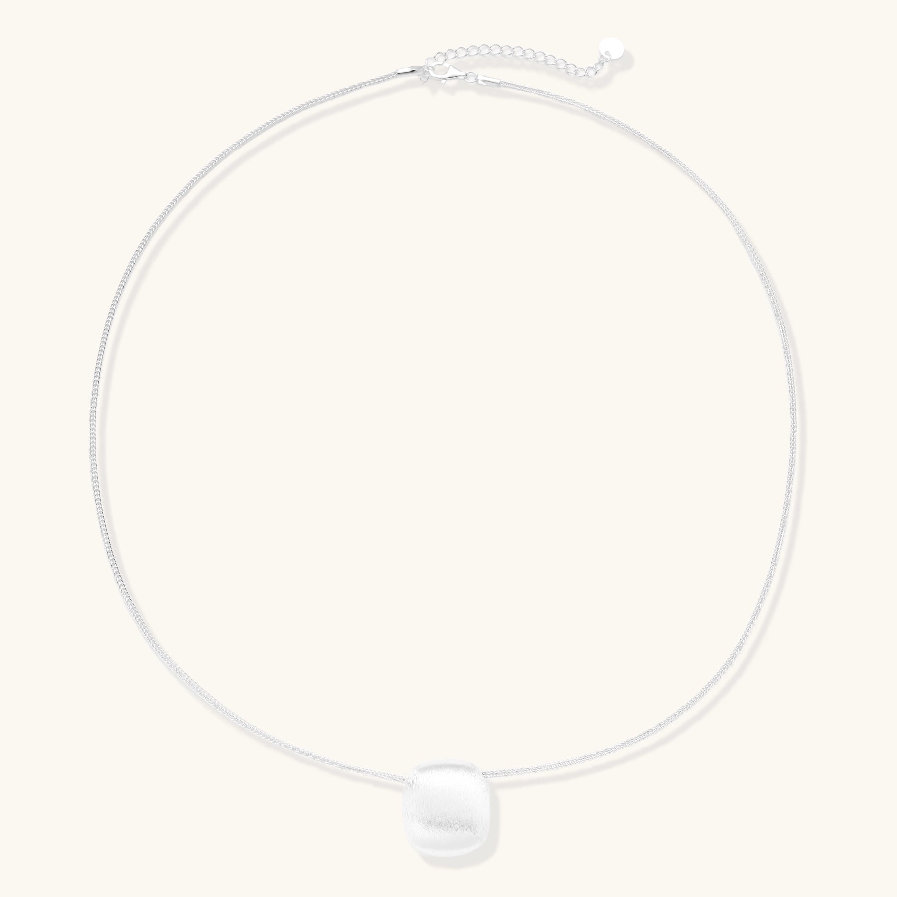 Minimalist sterling silver necklace with brushed square pendant on adjustable chain against white background.